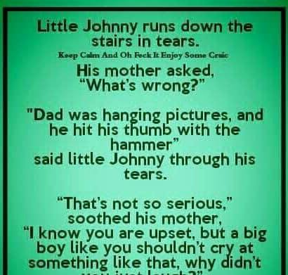 Between his sobs, Johnny managed to say, “Dad was hanging pictures, and he hit his thumb with the hammer!”