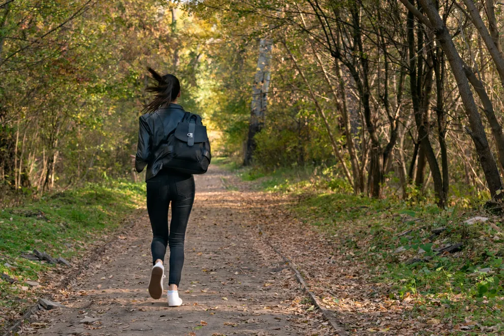 Young woman runs away from someone in the park. | Source: Shutterstock