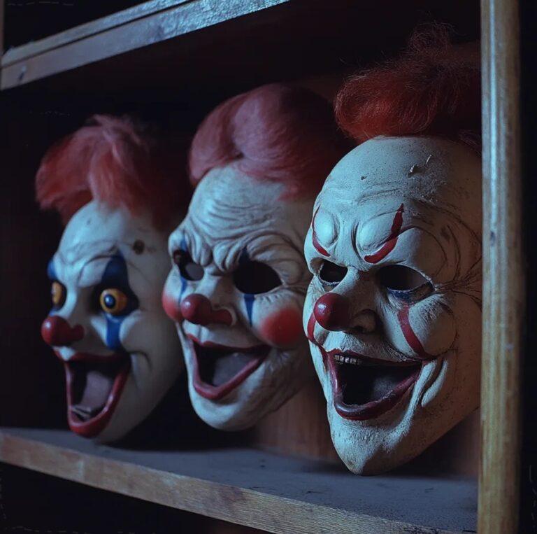 There they were—faces staring back at me. One with exaggerated makeup, another in a torn red hood. My breath caught in my throat.
